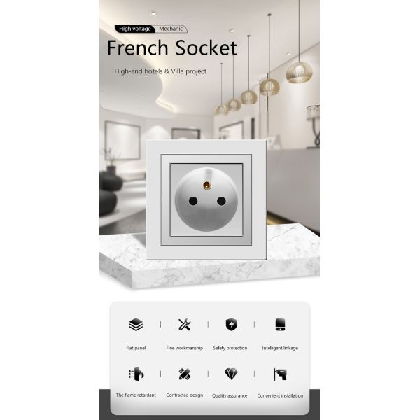 French sockets are suitable for European countries and comply with European socket production standards and use. It is a two round hole zero live wire, and there is a cylindrical grounded copper rod on the socket, which can withstand up to 16 amperes of current and 250 voltage components. With safety device and quick terminal connection. Made of the best metal materials, it has a certain degree of safety and protection.